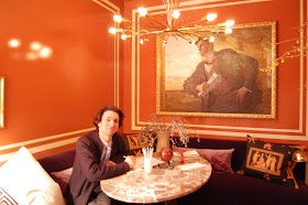 The room was painted a lovely orange/brown color which were varnished to create a sheen that reflects light. There were absolutely no architectural details in the room so Garrow created them using paint, an easy trick that anyone could try at home. We discussed how hard it is to choose a paint color and he tried about four colors before settling on Benjamin Moore Terra Mauve. You really need to try paint out in your own space so you can tell how it will look because it can look dramatically different in a magazine or online. They can even look different in regular photos as you see from the first two photos that I took and the last three that were taken by
