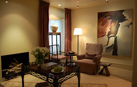 Even though the colors in the room are mauves and ivories, it is a room that balances the masculine and feminine so perfectly, that I think anyone would feel comfortable in this space. The lovely George III tea table can be used for eating or working and I love the sitting area by the fireplace for reading with the large abstract painting by Stephen Pace (available through the Katharina Rich Perlow Gallery) behind it. What's funny is that another designer in the show house also uses a Stephen Pace painting in his room and there is a lot of other abstract paintings used this year. The house is full of wonderful coincidences that help the flow.