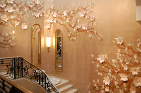 From this vantage point, you can see where the more modern upper floors meet the still grand lower floors. When I was upstairs, I thought the flowers on the wall looked like a French porcelain wall decoration but I would soon find out they were not!