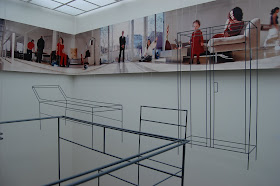 Back up on the fifth floor, Janna Bullock was given the not so easy task of decorating the elevator landing but decided to think outside the box literally! I've known of Janna Bullock for a few years since she shared the same publicist as the designer I used to work for but I didn't know about her design work until recently. She is an international real estate developer from Russia who has always been involved with the interiors of her buildings and is also wonderful patron of the arts which is why her room was designed as a collector's retreat. The floating furniture/sculpture is by the Russian artist Anya Zholud while a Sam Taylor Wood photograph of a family in a home wraps around the walls. The photograph on the while walls makes the space look like an art gallery but the subject matter makes it look like a room in a house with the "furniture." I think it's a space that makes you think which I really appreciated!
