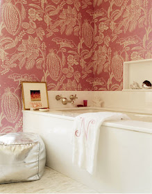 Amanda's husband was very glad that there was no pink in the bathroom but that was before the wallpaper was installed above the tub (below)! He's ok with it now because he can't see it from the shower! Pink is a very good for your complexion so I bet it's nice to put on make up in this bathroom! I think it's funny that Amanda teased me for hating color because I really do like it and especially in her apartment! But I'll still let her take credit for converting me! But only if I can come over and visit her art!