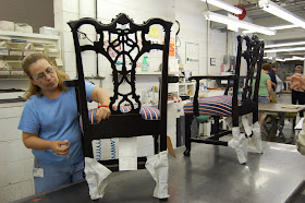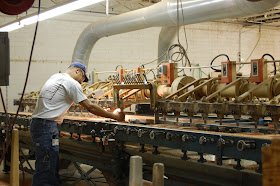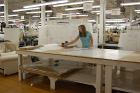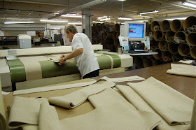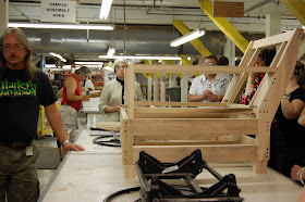 Hickory Chair upholstery factory on the second day of our tour. Before we could see them actually upholstering the furniture, we were able to see how they cut the wood frames and turn the legs on which the upholstery will later be applied. The frames at Hickory Chair are made of only kiln dried hardwood frames that prevent warping. "Cherry and maple woods are used in the stress areas of the upholstered frames and exposed mahogany is finger-jointed to the hardwood frame for extra strength." The frames are so well made that the furniture can be reupholstered time and again and will last for a very long time. Jay Reardon told us a story about an upholsterer who came up to him and told him that he has recovered many Hickory Chair pieces over the years and the quality is unmatched. He also asked Jay to thank his employees for not cutting corners!