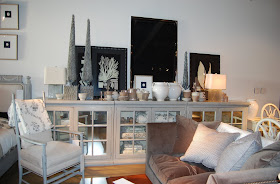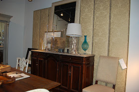 Hickory Chair Creative Director, Ron Fiore, was challenged with styling the 5,000 square foot showroom and he accessorized this wall as a chic ladies bathroom. The mirrored dresser here could also be ordered without the mirrors or just a mirrored top or front. If you can dream it, they can make it.